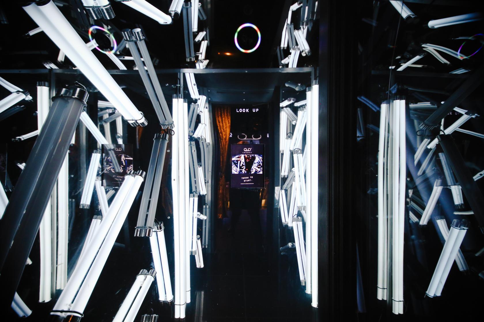 The venue exudes an air of opulence, with walls adorned in a lavish copper effect and a captivating chandelier reminiscent of a gramophone horn suspended above the stairwell. A neon-lit bar at the entrance sets the scene for an enchanting ambience.
